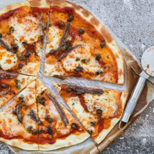 Calzone: tomaat, kaas, ham, salami, champignons, knoflook, oregano